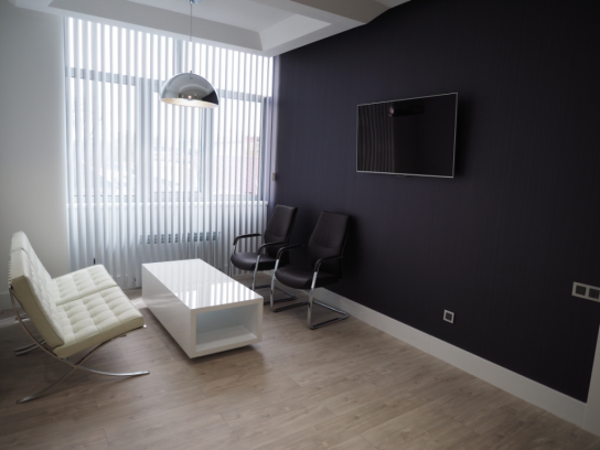 Зона для отдыха или для приема посетителей. Итальянский диван Барселона натуральная кожа, цвет: белый, кресла для посетителей Fuga (производство Россия), натуральная кожа, цвет: черный, журнальный столик в Итальянском стиле, глянцевый акрил, цвет: белый.