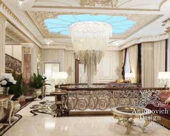 В дизайн проекте дома классический стиль очень гармонично переплетен с праздничным стилем ар деко. Захватывает дух от восторга центральная часть дома, где роскошная лестница стала центральной осью великолепия апартаментов дома. Дизайнеры интерьера, проникнувшись настроениями и желаниями владельцев дома, особое внимание уделили освещению. В результате интерьер искрится прекрасными переливами хрусталя и блеском декоративных решений в оформлении полов и стен. В мраморной глади пола с изысканными резными узорами отражаются блики роскошных люстр, которые прикреплена к потолку второго этажа. Потолок, откуда берет свое начало люстра, украшен в лучших традициях классического стиля изысканным лепным декором, а также современной круглой нишей из акрила с нежно-голубой подсветкой. Большая лестница с плавными очертаниями и круглым основанием выглядит очень роскошно и грациозно. Кованные золоченые завитки балюстрады подхватывают мотивы завитков узоров на мраморном полу. За лестницей дизайнеры интерьера студии Antonovych Design расположили уютную гостиную. Здесь прекрасным авторским решением стало переплетение мотивов убранства окон и декора стен с объемными 3D панелями и текстильными. Сочетание благородного бархата, натурального шелка, мрамора, ценных пород дерева придают авторскому интерьеру аристократические и благородные черты. Дизайн дома Алматы стал отражением роскоши новой эпохи и новым шедевром от талантливых авторов.