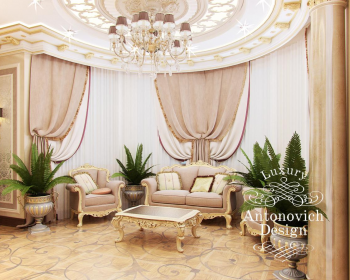 Спальня в доме – это особенные апартаменты, которые призваны служить приятным моментам отдыха и наслаждения. Роскошный интерьер спальни объединил в себе мотивы элегантной классики и нарядные акценты ар деко. Просторные апартаменты включают в себя две отдельные зоны. Непосредственно спальную зону и зону отдыха у окна. Пышное убранство присуще всем элементам декора. Роскошные потолки украшают круглые ниши с подсветкой сквозь завитки золотистых узоров, и нарядные люстры с хрустальными подвесками. Дизайн спальни обрел свое особенное солнечное и праздничное настроение, благодаря теплой цветовой гамме и обилию золота в декоре. Резные золоченые рамы гармонично сочетаются с резной инкрустацией мебели. Объединяет это теплое и уютное настроение паркетный пол с резными узорами. Соблазнительную нежность и комфорт олицетворяет роскошная кровать с высоким резным изголовьем. Она вынесена на невысокий круглый подиум. А завершенной эту прекрасную композицию делают две грациозные колонны с лепными золочеными капителями. Роскошные апартаменты спальни с выразительными акцентами и уютным характером стали гармоничным продолжением дизайн концепции, которая присуща и остальным апартаментам в доме.