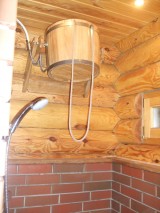 Посредством тазов очень комфортно мыться, если для этого предусмотрено специальное сидение и, там же, смеситель для горячей и холодной воды. Шикарный вариант - каменная плита, которая, одновременно, послужит и сидением, и местом расположения таза, а прямо над ним, хорошо бы организовать кран для воды: набрал в таз горячую воду, обдал ею плиту, сел, набрал комфортную для мытья, жидкость в таз… Остается только пожелать вашему телу приятного взаимодействия с вихоткой и душистым мылом! В Китае, например, в их знаменитых банях, такие сидячие места для мытья, дополнительно оснащаются гибкими душевыми шлангами, при помощи которых, не вставая с места, можно обмыться проточной водой. Внимание: важное значение имеет обязательное наличие в помывочной нескольких канализационных трапов в полу, как в душевой зоне, так и в обмывочной. И защитите себя от падений на скользком полу – положите под ноги специальные деревянные или пластиковые решетки! Как вы уже догадались, при наличии небольшой помывочной, все необходимые зоны для мытья и охлаждения влагой, можно организовать в одном месте: так, чтобы и душ, и сиденье, и кран для таза, а сверху – ведро-водопад… Правда место для такой, уже не душевой, должно быть от 2,5 кв.м.