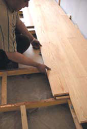 Здесь мы разберем работу со шпунтованными досками, но и для гладких используются те же базовые приемы. Вам понадобится рабочая платформа. Сделайте ее из нескольких уложенных рядом и незакрепленных досок. Измерьте ширину или длину комнаты (расстояние, перпендикулярное лагам). Доску надо обрезать так, чтобы между каждым ее концом и стеной комнаты осталось расстояние не менее 9 мм. За один раз укладывайте 4 – 6 досок. Чтобы правильно состыковать две короткие доски, обрезайте их так, чтобы они соединялись на середине балки. При этом стыки нескольких досок не должны выстраиваться в одну линию. Гвозди для таких работ должны быть специальными, паркетными. Или иметь маленькие шляпки, а длину, по меньшей мере, вдвое больше доски.