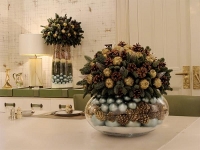 Самый простой вариант: широкую прозрачную вазу наполнить нашими веточками, шишками, орешками, разноцветными шариками (можно добавить елочный шар большего диаметра) и «подарочками» из спичечных коробков и пенопласта. Получится вот такая красота.